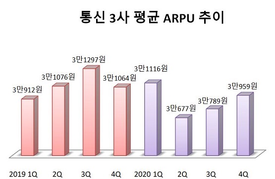 10일 각 사에 따르면 이통 3사의 지난해 4분기 평균 ARPU는 3만959원이었다. 1분기 3만1116원보다 낮고, 전년 동기 3만1064원보다는 105원 낮은 수치다.
