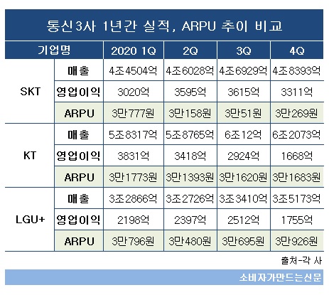매출 규모 역시 ARPU 순서와 같은 흐름이나 영업이익과 비례하지는 않는다. SK텔레콤이 영업이익은 1조3541억 원으로 3사 중 가장 높았고 이어 KT(1조 1841억 원), LG유플러스(8862억 원)순이다.