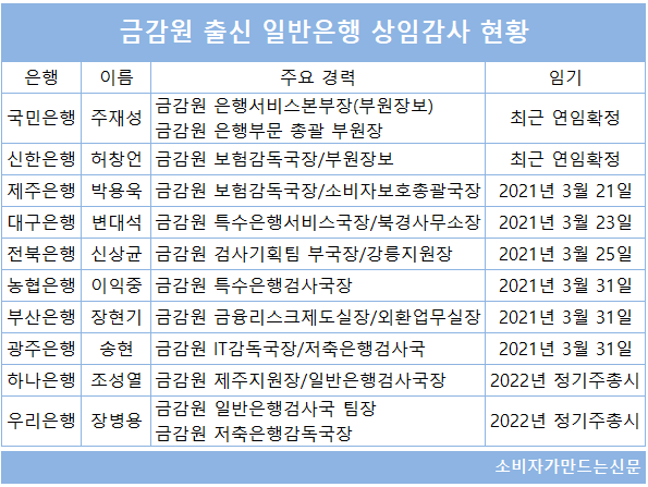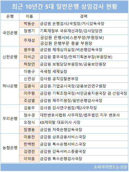 실제 국책은행인 기업은행을 제외한 5대 시중은행의 최근 10년 간 상임감사 선임 현황을 조사한 결과 신한은행과 농협은행은 줄곧 금감원 출신을 선임했다. 하나은행도 최근 상임감사를 지낸 3명 모두 금감원 출신이었고 국민은행도 3명 중 2명이 금감원 출신이었다. 우리은행은 지난해 선임한 장병용 상임감사가 유일한 금감원 출신이다.