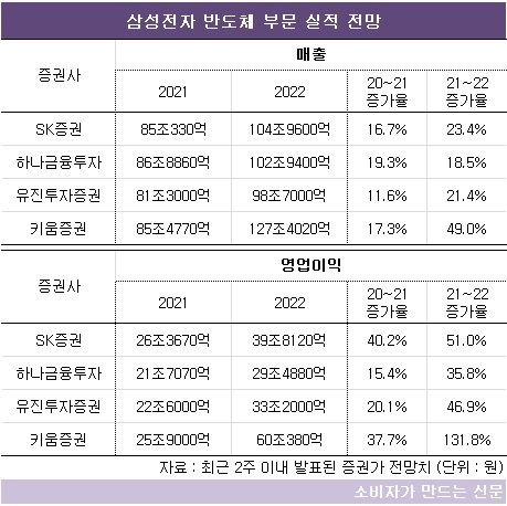 삼성전자 반도체 매출을 가장 적게 잡은 유진투자증권도 98조7000억 원을 예상해 100조 원에 근접할 것으로 관측했고 키움증권은 120조 원 이상을 예상했다.