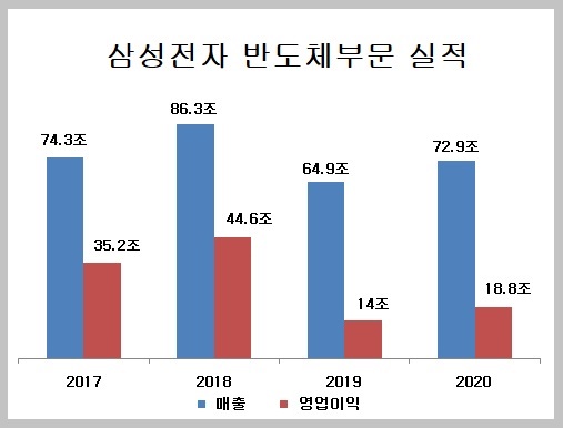 삼성전자 반도체 부문은 연간 매출 100조 원 이상을 기록한 적이 아직까지 없다. 반도체 호황기로 평가받는 2017년과 2018년에도 매출은 74조~86조 원 수준이었다.