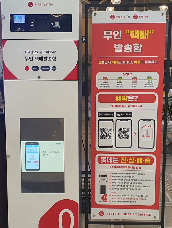 무인택배함은 소형화물(세 변합 최대 100㎝ 이하) 전용이며 롯데택배 앱·홈페이지를 통해 예약 접수 후 이용할 수 있다. 서울에서 부산까지의 택배비는 2500원으로 추가 요금 없이 발송이 가능하다.