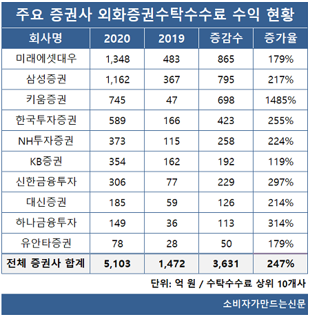 금융투자협회에 따르면 지난해 증권사의 외화증권수탁수수료 전체 수익은 전년 대비 247% 증가한 5103억 원이었다. 특히 수수료 수익 상위 10개사 모두 세자리 수 이상의 증가율을 보였다.