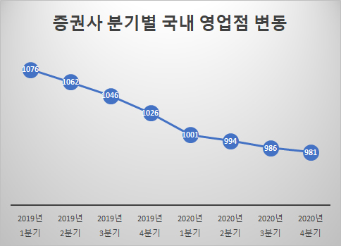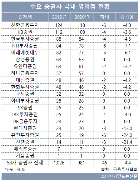 22일 금융투자협회에 따르면 지난해 말 58개 증권사의 국내 영업점은 981개로 전년(1026개) 대비 45개(4.4%)가 줄었다.