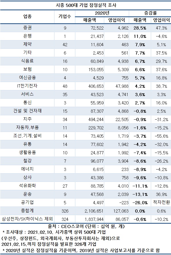 IT전기전자, 증권, 보험 등 11개 업종은 코로나19 수혜로 영업이익이 19조 원 이상 늘었지만, 조선·기계·설비, 자동차·부품, 철강을 포함한 11개 업종은 실적이 부진했다.