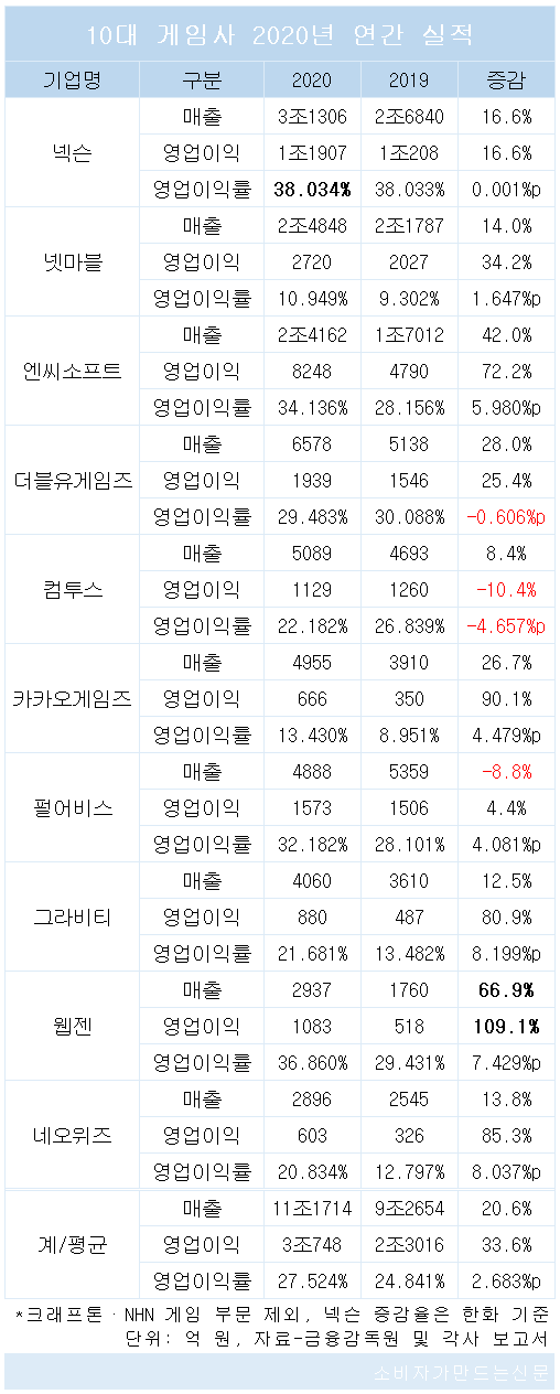 넥슨(대표 이정헌)은 업계 최초로 매출 3조 원을 달성했으며 엔씨소프트(대표 김택진)도 창사 이래 매출 2조 원을 첫 돌파하는 쾌거를 올렸다. 웹젠(대표 김태영)은 네오위즈(대표 문지수) 매출을 근소한 차이로 앞질렀고 영업이익도 세 자릿수 비율로 급증하는 호조를 누렸다.