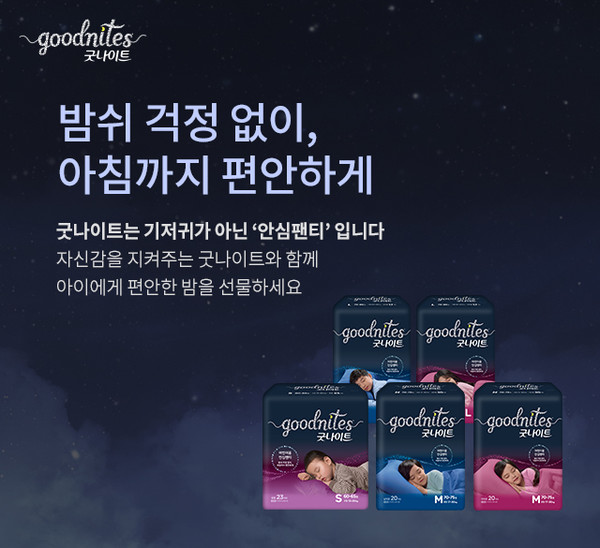 '굿나이트' 신제품은 기존대비 15% 더 넓어진 흡수패드를 적용했다. 흡수속도는 약 2배로 빨라졌다. 원터치 매직테이프가 적용되어 조절도 용이하다.