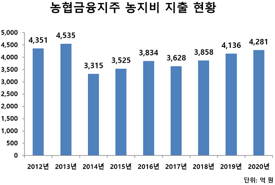 지난해 농협금융지주가 농협중앙회에 지급한 농지비는 전년 대비 3.5% 증가한 4281억 원으로 지난 2017년 이후 4년 연속 증가했다. 지난 2012년 신용·경제사업 분리 이후 연간 농지비 최대 지출금액은 2013년에 기록한 4535억 원이었는데 2012~13년도는 신경분리 이전인 ‘종합농협’ 실적이 기준이었다.