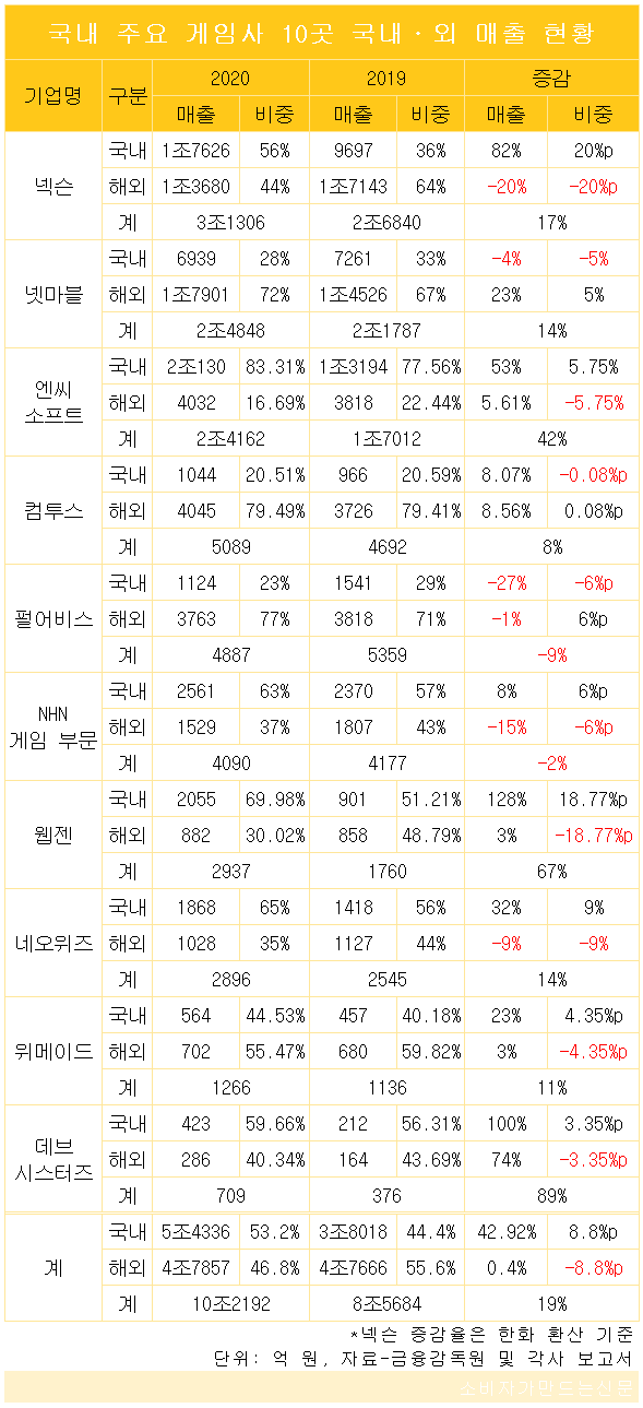 이에 따라 10대 게임사 중 넷마블(대표 권영식·이승원)과 컴투스(대표 송병준), 펄어비스(대표 정경인)를 제외한 7개사가 전체 매출에서 해외매출이 차지하는 비중이 하락했다.