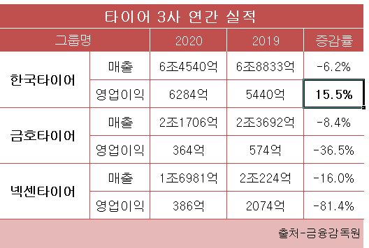 영업이익은 한국타이어만 웃었다. 6284억 원으로 15.5%나 올랐다. 전 세계 수요감소는 피하지 못했지만 수익성 좋은 유럽, 북미, 중국 등에서 RE 판매를 늘렸고 수익성 높은 고인치 타이어 판매 비중을 확대한 덕을 봤다. 특히 중국에선 신차용 타이어(OE) 수요도 올랐다.