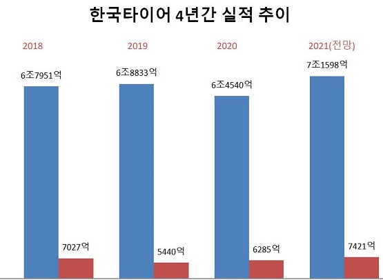 금융정보업체 에프앤가이드에 따르면 한국타이어는 최근 4년 내 가장 좋은 성적이 전망된다. 매출은 7조 원(7조1598억 원)이 넘고 영업이익도 7000억(7421억 원) 돌파를 예상하고 있다.