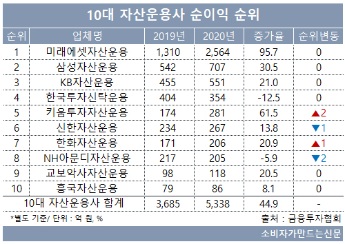 금융투자협회에 따르면 국내 10대 자산운용사의 별도재무재표 기준 당기순이익은 5338억 원으로 전년 대비 44.9% 증가했다.