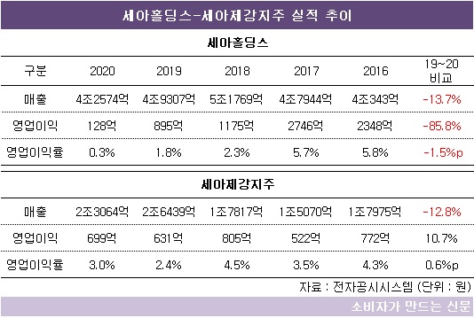 전자공시시스템에 따르면 세아홀딩스는 지난해 매출과 영업이익이 전년에 비해 각각 13.7%, 85.8% 감소했다.