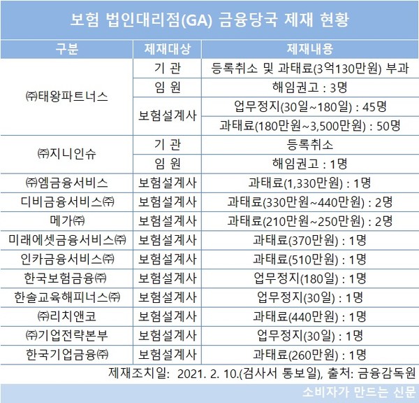 이밖에 △㈜엠금융서비스 △디비금융서비스㈜ △메가㈜ △미래에셋금융서비스㈜ △인카금융서비스㈜ △한국보험금융㈜ △한솔교육해피너스㈜ △㈜리치앤코 △㈜기업전략본부 △한국기업금융㈜ 등 10개 GA에는 소속 보험설계사 12명에 대한 과태료와 업무정지 제재가 부과됐다.
