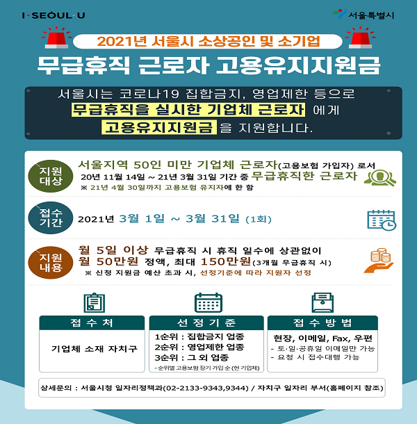 지원 대상은 2020년 11월 14일부터 2021년 3월 31일까지 월 5일 이상 무급휴직을 시행한 소상공인 및 소기업 등 서울지역 50인 미만 기업체 근로자 중 2021년 4월 30일까지 고용보험을 유지하는 근로자다. 2020년에 무급휴직 고용유지지원금을 받은 경우에도 이어서 신청 가능하다.
