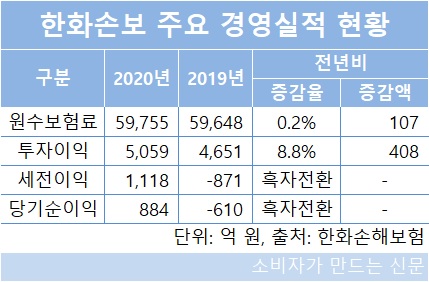 한화손해보험은 지난해 당기순이익 884억 원을 기록했다. 전년도에 610억 원의 영업손실을 기록했던 부진을 단숨에 벗어난 것이다. 원수보험료는 5조9755억 원으로 집계됐으며 투자이익은 전년 대비 8.8% 증가하며 5천억 원을 돌파했다. 세전이익 역시 1118억 원을 기록했다.
