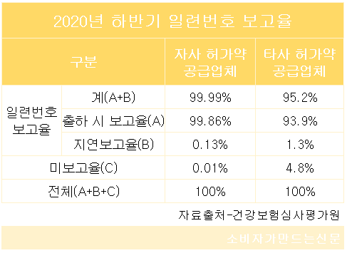 심사평가원이 지난해 하반기 '의약품 출하 시 일련번호 보고 현황'을 분석한 결과 출하 시 일련번호 보고율은 △제조·수입사(자사 허가 의약품 공급업체) 99.86% △도매업체(타사 허가 의약품 공급업체) 93.9%로 나타났다.