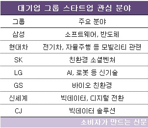 삼성과 LG는 각각 소프트웨어·반도체, 인공지능(AI) 현대자동차는 모빌리티 분야에 관심을 쏟고 있다. SK와 GS는 친환경, CJ와 신세계는 유통에 접목시킬 빅데이터 분야 스타트업 투자에 힘쓰고 있다.