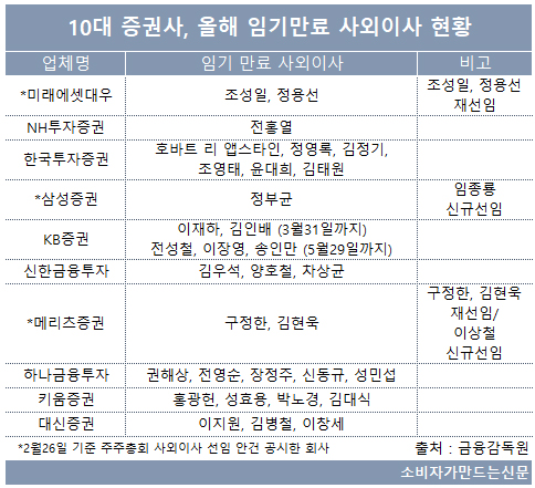 실제로 2월 26일 기준으로 사외이사 재선임안을 공시한 미래에셋대우(대표 최현만·조웅기)와 삼성증권(대표 장석훈), 메리츠증권(대표 최희문)의 경우 기존 사외이사를 대부분 재선임할 방침이다.