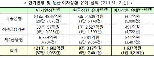 올해 1월 말 기준 금융권은 만기연장 121조 원, 원금상환유예 9조 원, 이자상환유예 1637억 원 등 총 130.4조 원을 지원하고 있는 상황이다. 특히 이자상환 유예의 경우 규모도 크지 않고 대부분 자발적으로 상환하고 있으며 4월 이후 유예금액도 감소하는 추세다.