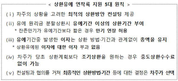 예를 들어 차주가 선택 가능한 상환방법으로는 ▲기존 월상환금액의 2배씩 상환(만기유지) ▲기존 월상환금액의 1.5배 상환(유예기간만큼 만기연장) ▲기존 월상환금액의 1.2배씩 상환(유예기간보다 장기로 만기연장) 등이 가능하며 연착륙 지원 5대 원칙을 준수하는 범위 내에서 다양한 방안을 활용할 수 있다는 설명이다.