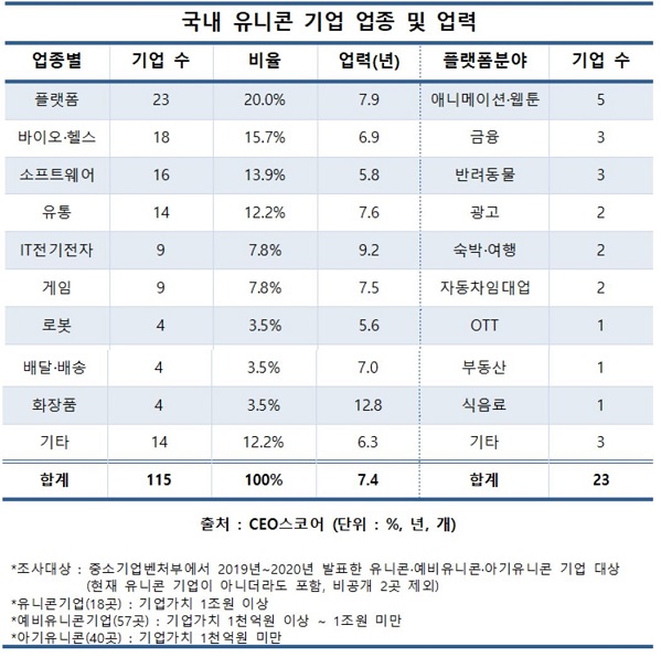유니콘 기업의 업종은 플랫폼이 23곳으로 가장 많았다. 애니메이션·웹툰 기업과 금융, 반려동물, 광고, 숙박·여행, 자동차임대업 등 다양한 플랫폼 분야에서 유니콘 기업이 등장했다. 유니콘 기업 창업주의 94.3%는 남성으로, 여성 비중은 5.7%에 그쳐 남성 중심적 문화가 엿보였다.