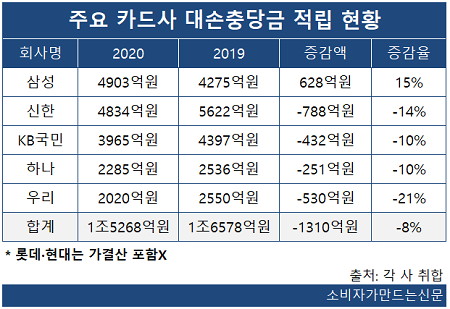 신한카드(대표 임영진)와 KB국민카드(대표 이동철), 우리카드(대표 김정기), 삼성카드, 하나카드(대표 장경훈) 등 5개 신용카드사의 지난해 대손충당금 적립은 총 1조3104억 원으로 전년도 1조6578억 원에 비해 8% 감소했다.