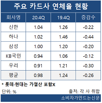 이외에도 신한카드의 지난해 연체율은 1.04%로 전년 1.26% 대비 0.22%포인트 감소했고 삼성카드와 KB국민카드도 지난해 연체율이 1%와 0.94%를 기록하며 전년 대비 각각 0.2%포인트 0.12%포인트 감소했다.