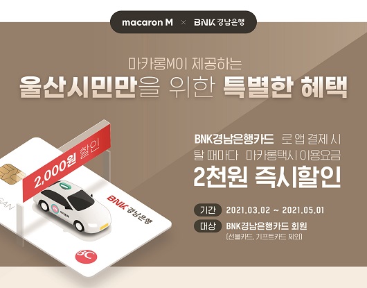 경남BC카드 마카롱M택시 할인 이벤트 기간 마카롱M앱에 등록된 경남BC카드로 울산광역시 마카롱M택시를 이용하면 횟수제한 없이 택시요금 2000원을 즉시 할인해준다. 마카롱M앱 등록은 경남BC카드에서 가능하며 선불카드와 기프트카드는 제외된다.