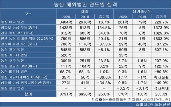 당기순이익은 농심 미국 법인이 261억 원을 벌어들여 가장 큰 수익을 냈고, 홍콩 법인이 유일하게 2000만 원 적자를 기록했다. 칭따오 농심푸드와 선양 농심 푸드, 옌벤 농심 미네랄 워터 음료는 순이익이 10배 이상 증가했고, 일본 법인(607%)과 미국 법인(229.7%)도 순이익이 크게 늘었다.