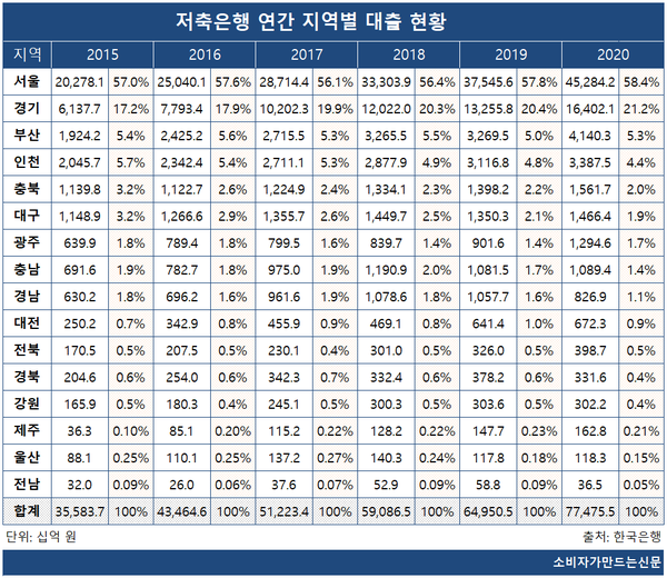 9일 한국은행에 따르면 지난해 국내 저축은행의 전체 여신액(대출액) 77조4754억 원 중 수도권이 차지하는 금액은 65조738억 원으로 전체의 84%에 달하는 것으로 집계됐다.