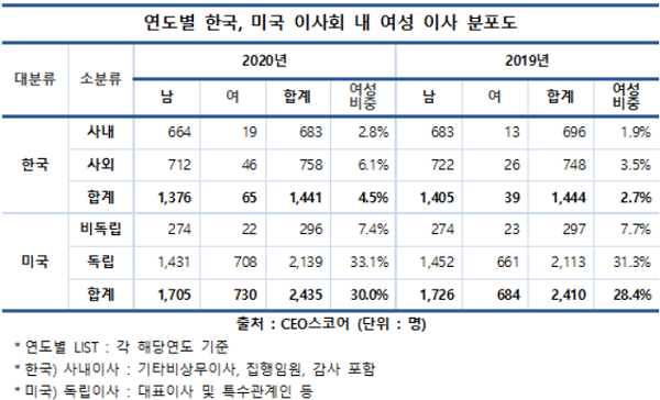 여성 대표이사 수도 미국과 차이가 컸다. 국내 등기임원 중 여성 대표이사는 조희선 한세실업 대표가 포함되면서 기존 이부진 호텔신라 사장, 김선희 매일유업 사장, 한성숙 네이버 사장 등 3명에서 총 4명으로 늘었다.