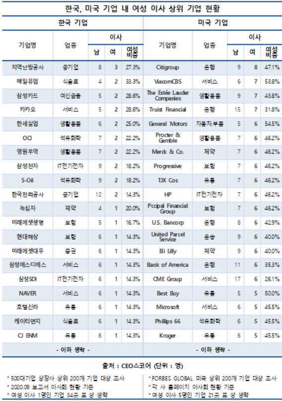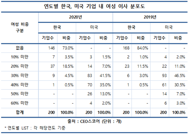 여성임원이 늘었지만 200대 상장사 여성 등기임원 비중은 100명 중 4.5명꼴로, 포브스가 선정한 미국 200대 기업과 비교하면 여전히 격차가 컸다. 미국 200대 기업은 등기임원 2435명 중 여성 등기임원 비중이 30%(730명)로 3명 중 1명 수준이다.