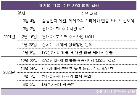 재계 관계자는 “AI, 수소 등 미래 신사업 분야에서 독자 기술 개발에 집중해 왔던 대기업들이 협업을 통한 시너지 창출에 나서는 일이 늘고 있다”며 “혼자서 개발하고 사업을 추진하는 것보다 여러 기업이 연합할 경우 더 강력한 힘을 낼 수 있는 분야를 중심으로 전략의 변화가 생기고 있다”고 말했다.