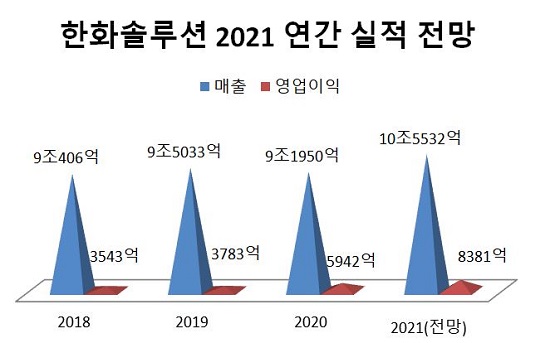 금융정보업체 에프앤가이드에 따르면 한화솔루션은 예상 연간 매출 10조5532억, 영업이익 8381억 원이 점쳐진다. 전년 대비 매출은 14.7% 영업이익은 41.0% 오르는 수치다. 최근 4년간 매출, 영업이익 모두 최고 수치에 해당한다.