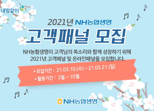 모집인원은 고객패널 10명과 온라인패널 20명을 합쳐 총 30명이다. 농협생명은 다양한 소통창구를 마련하기 위해 올해부터 온라인 패널을 별도 모집하며, 인원도 기존 10명에서 30명까지 확대했다.