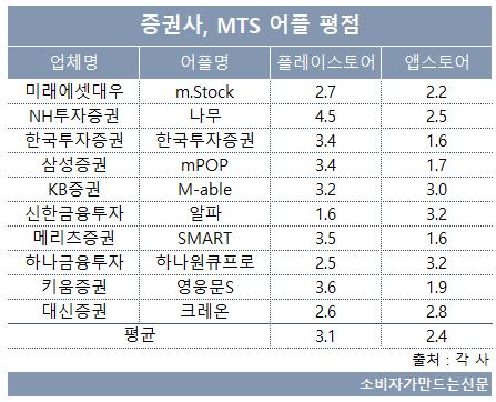 소비자가만드는신문이 자산 기준 10대 증권사의 MTS 어플 평점을 조사한 결과 5점 만점에 2~3점 수준에 불과했다. 특히 안드로이드 스마트폰 어플을 다운받을 수 있는 플레이스토어는 3.1점이었지만 아이폰용 앱스토어의 평점은 2.4점으로 더 낮았다.