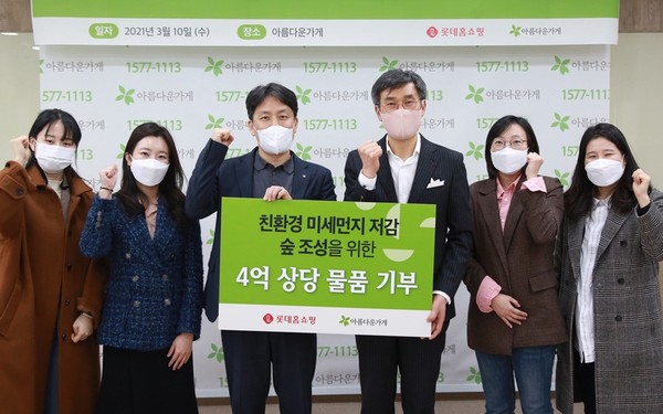 롯데홈쇼핑은 지난해 12월 환경부 등과 ‘미세먼지 취약계층보호 및 기후 위기 대응을 위한 업무 협약’을 체결하고, 도심 녹지 조성사업을 지원하고 있다. 저탄소 전환에 기여하고, 고농도 미세먼지로부터 취약계층을 보호하기 위한 친환경 사회 공헌 활동의 일환이다.