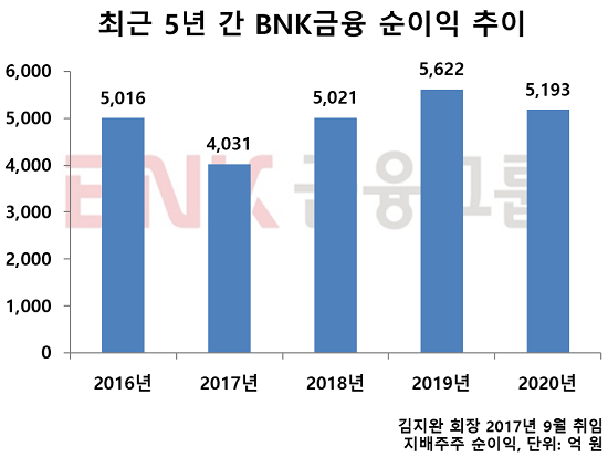 부산은행의 지난해 순이익은 전년 대비 17.7% 감소한 3085억 원, 경남은행은 9.4% 감소한 1646억 원에 그쳤는데 그 결과 은행 수익 비중이 높은 BNK금융지주의 순이익도 같은 기간 7.6% 줄어든 5193억 원에 머물렀다. BNK금융지주는 지난 2019년 순이익이 5622억 원으로 역대 최대순익을 기록했지만 1년 만에 역성장으로 전환됐다.