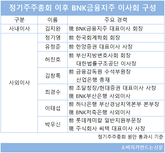 다른 후보로는 대주주인 롯데그룹 출신 인사인 박우신 (주)씨텍 대표이사, 이태섭 BNK저축은행 사외이사가 신규 사외이사 후보로 이름을 올렸다. 신규선임 사외이사 후보 3명 중 2명(최경수, 이태섭)이 현직 BNK금융 계열사 사외이사인 점도 흥미로운 대목이다.