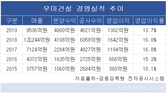 우미건설 매출은 공사수익과 분양수익이 큰 비중을 차지하고 있다. 사업지가 늘어나고 아파트 브랜드 '우미 린(Woomi Lynn)'과 주상복합 브랜드 '린스트라우스(Lynn Straus)' 인지도가 높아지면서 분양수익이 호조를 보이며 공사수익을 앞지르는 모양새다. 2019년 기준으로 분양수익은 매출의 51%, 공사수익은 48% 비중을 기록했다.