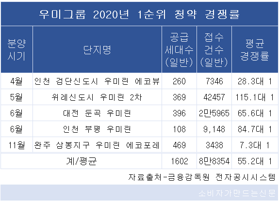 '우미 린'의 1순위 청약 경쟁률 지난해 평균 55.2대 1을 기록했다. △'위례신도시 우미린 2차' 115.1대 1 △'인천 부평 우미린' 84.7대 1 △'대전 둔곡 우미린' 65.6대 1 등 높은 청약률로 전세대 1순위 청약 마감을 이어갔다.