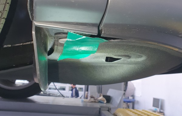 혹시나 하는 마음에 차량 하부를 살피니 엔진룸 하부 커버가 나사로 조립되지 않고 청테이프로 마감처리된 상태였다.