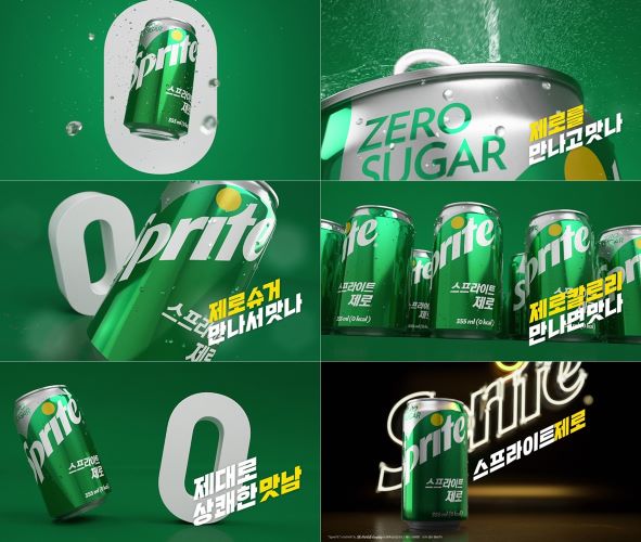 코카-콜라사에 따르면 특히 스프라이트 고유의 그린 컬러와 옐로우, 제로의 그레이 컬러를 화면 가득 활용하며 제품 특징과의 시각적 연결고리를 강화했다.