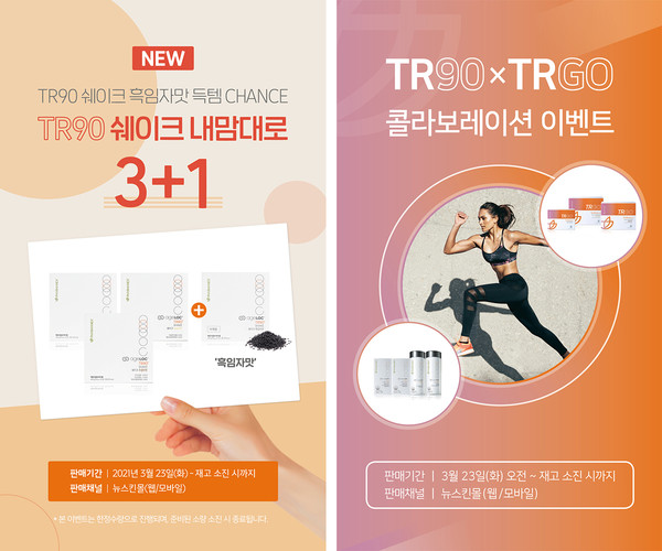 먼저 ‘TR90 쉐이크 내맘대로 3+1 이벤트’에서는 TR90 쉐이크 3박스 구매 시 TR90 쉐이크 흑임자맛 1박스를 추가 증정한다. TR90 쉐이크 흑임자맛은 출시 예정인 제품으로 1회 섭취 시 열량 125Kcal와 단백질 17g을 제공해 굶지 않고 체중 조절을 할 수 있도록 도와준다.