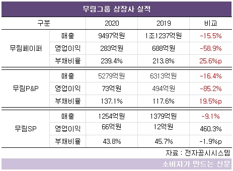 금융감독원 전자공시시스템에 따르면 무림그룹 12개 계열사 중 상장사인 무림페이퍼, 무림P&P, 무림SP 등 3곳은 지난해 매출이 모두 감소했다.