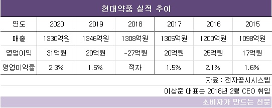 현대약품은 2018년 2월 이상준 대표가 재임하기 1년 전부터 지난해까지 4년 동안 줄곧 1300억 원대 매출을 이어가고 있다. 다만 지난해 영업이익은 2011년 이후 9년 만에 30억 원 이상을 기록했다. 지난해 영업이익률도 2.3%로 2010년대 들어 두 번째로 높다.