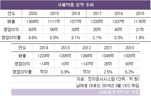 남 대표 취임 전 5년 사이 국제약품은 두 번이나 적자를 냈지만, 재임 후인 2015년부터는 적자가 단 한 번도 없다. 지난해 영업이익은 60억 원으로 2010년 이후 가장 많다.