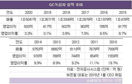 하지만 허 대표가 CEO로 취임하기 전인 2010년부터 2014년까지 5년 동안 연평균 980억 원이던 영업이익은 재임 후 평균 670억 원으로 줄었다. 최근 3년간 평균 영업이익은 470억 원으로 더욱 감소했다. 2010년 20%에 육박하던 영업이익률은 지난해 3.3%로 불과하다.