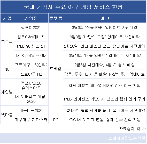 야구게임 명가로 불리는 컴투스(대표 송병준)와 넷마블(대표 권영식·이승원)은 일찌감치 대규모 업데이트에 앞서 사전예약에 돌입했으며 게임빌(대표 송병준)도 시즌을 대비한 업데이트를 꾸준히 진행 중이다. 엔씨소프트(대표 김택진)는 차세대 야구 매니지먼트 게임인 모바일 신작 '프로야구 H3' 출시를 내달 초 앞두고 있다.